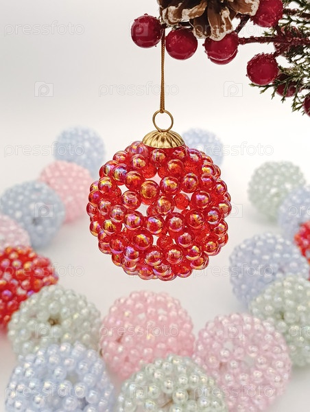 Элегантный рукодельный рождественский шар из красных бусин, висящий на праздничной вечнозеленой ветке с многоцветными шарами на заднем плане