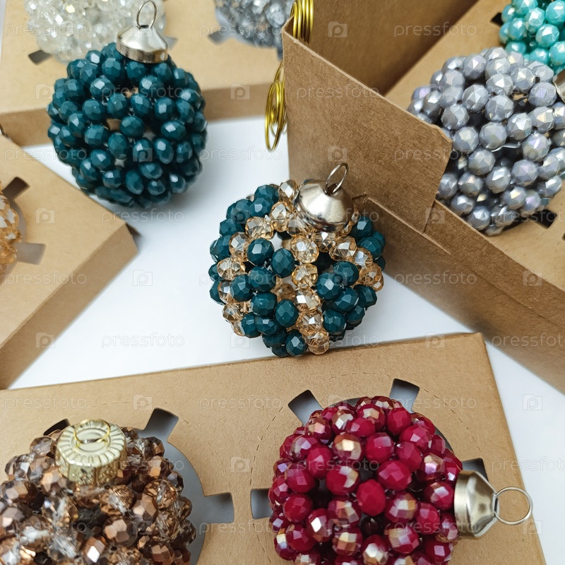 Коллекция элегантных рождественских шаров ручной работы, сделанных из хрустальных бусин различных цветов. Праздничные украшения выставлены в коробках для подарков. Концепция роскошного зимнего декора