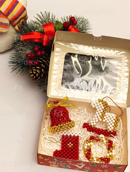 Ручная отделка бусин в золотом и красном цветах, украшенная как праздничное рождественское и новогоднее убранство в коробке для подарков.Уютное понятие зимних каникул