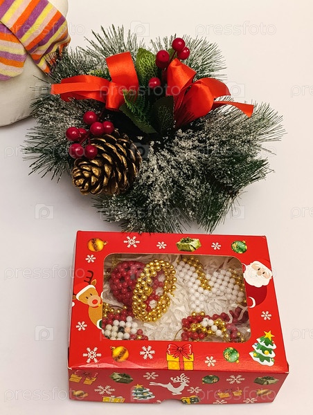 Ручная отделка бусин в золотом и красном цветах, украшенная как праздничное рождественское и новогоднее убранство в коробке для подарков.Уютное понятие зимних каникул