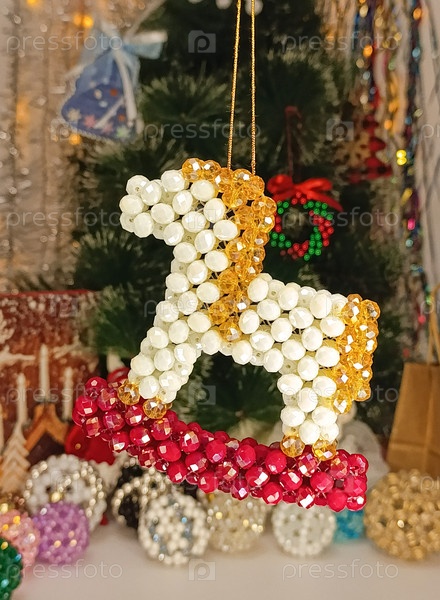 Ручной жемчужинный коневой орнамент белого, золотого и красного цветов, украшенный в качестве праздничного рождественского и новогоднего декора. Символ Года Лошади 2026 года по восточному календарю. Висящий перед елкой