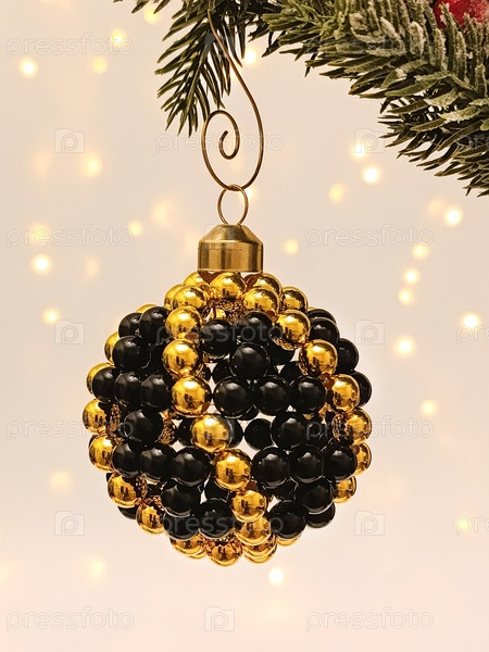 Элегантный рукодельный рождественский орнамент из черных и золотых бусин, висящих на праздничной вечнозеленой ветке с теплыми светящимися огнями в фоне.Уютная концепция зимних каникул с авторским правом