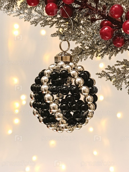 Элегантный рукодельный рождественский орнамент из черных и серебряных бусин, висящих на праздничной вечнозеленой ветке с теплыми светящимися огнями в фоне.Уютная концепция зимних каникул с авторским правом