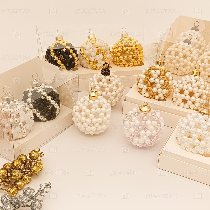 Коллекция элегантных рождественских шаров ручной работы, сделанных из бусин в белом, золотом и черном тонах. Праздничные украшения отображаются в подарочных коробках на светлом фоне. Роскошная концепция зимнего декора с авторским правом