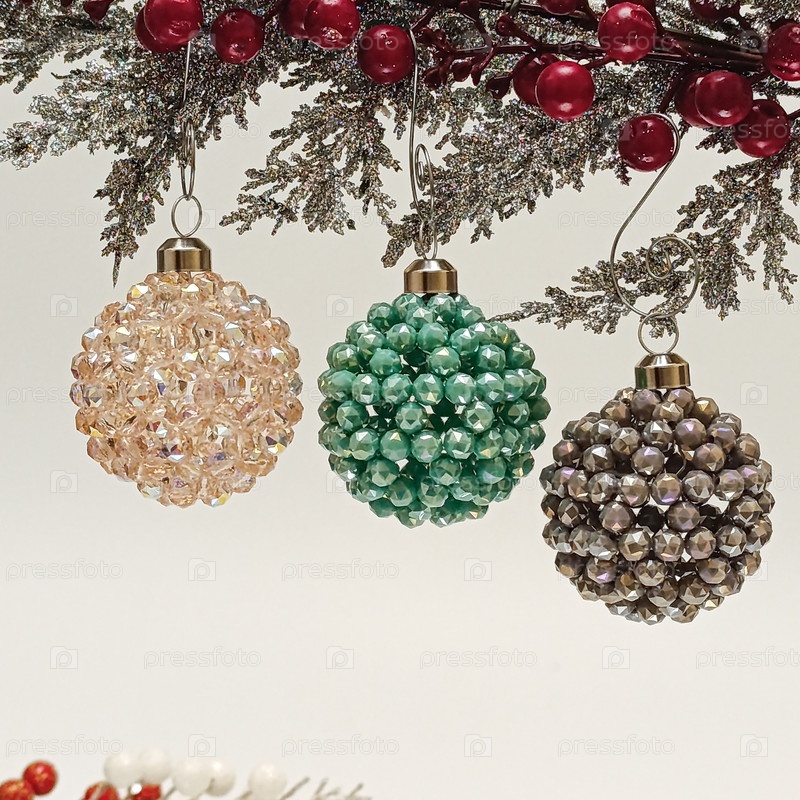Элегантные рождественские шары ручной работы сделаны из кристаллических бусин, висящих на праздничной ветке.Уютная концепция зимних каникул с авторским правом