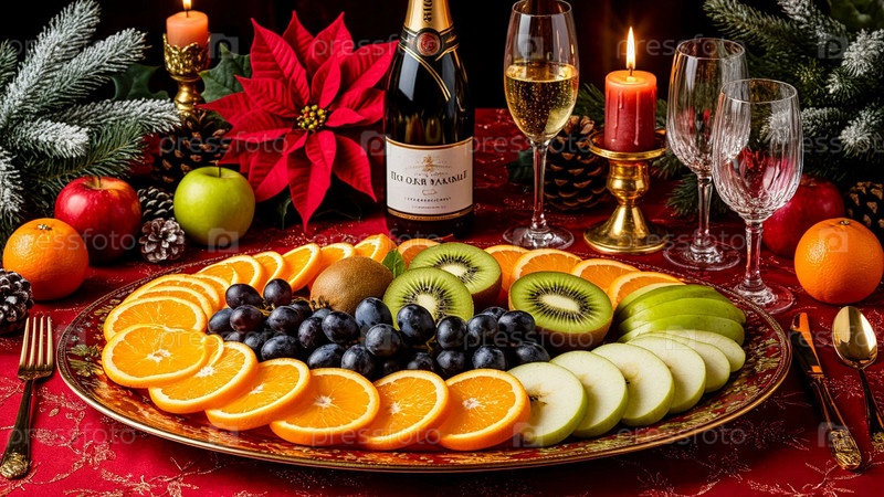 Служить на праздничном новогоднем и рождественском столе: свечи, бокалы, фрукты, скатерть