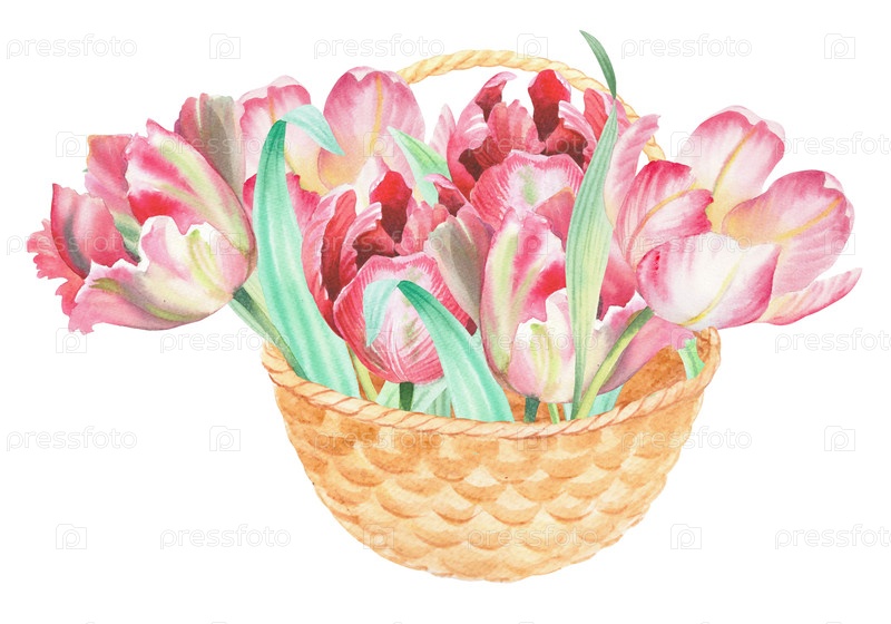Букет тюльпанов в корзине. Изображение акварели. Для ткани, обоев, упаковочной бумаги, поздравительных открыток, дизайна, декора и иллюстрации