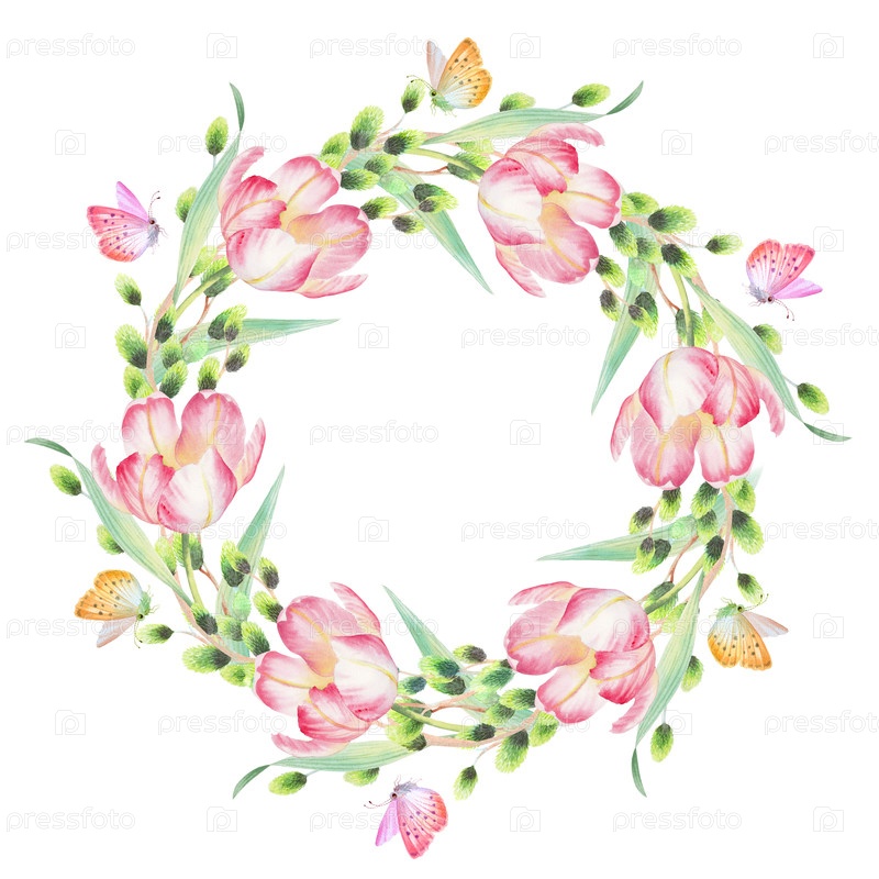 венок из ветвей ивы, тюльпанов и бабочек. акварельная иллюстрация. для ткани, обоев, упаковочной бумаги, поздравительных открыток, дизайна, декора и иллюстрации