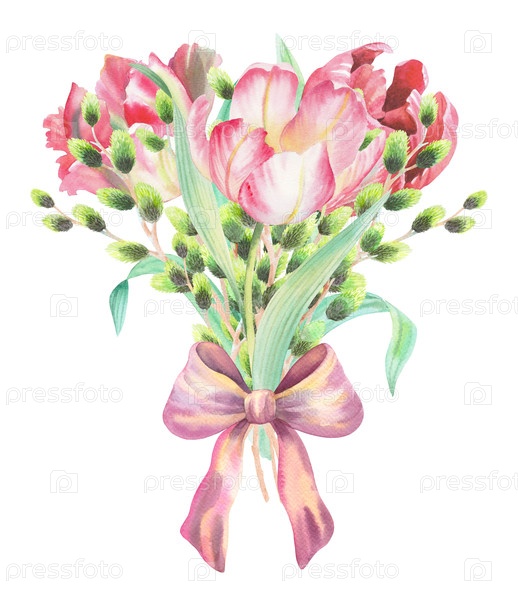 Букет тюльпанов и вербов с луком. Иллюстрация акварели. Для ткани, обоев, упаковочной бумаги, поздравительных открыток, дизайна, декора и иллюстрации