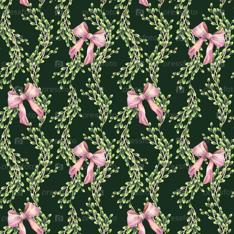 Бесшовный акварельный рисунок вертикальных рядов ветвей ивы с луками на зеленом фоне. для ткани, обоев, упаковочной бумаги, поздравительных открыток, дизайна, декора и иллюстрации