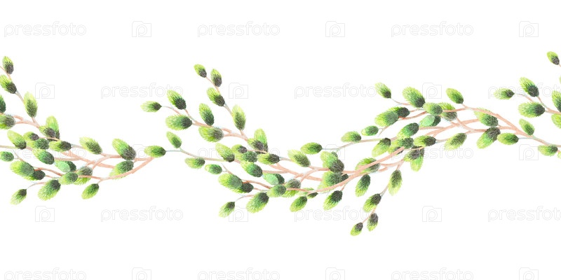 Бесшовная оболочка ветвей ивы. Иллюстрация акварелью. Для ткани, обоев, упаковочной бумаги, поздравительных открыток, дизайна, декора и иллюстрации