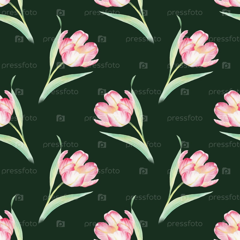 Бесшовный рисунок тюльпанов на зеленом фоне. Иллюстрация акварели. Для ткани, обоев, упаковочной бумаги, поздравительных открыток, дизайна, декора и иллюстрации