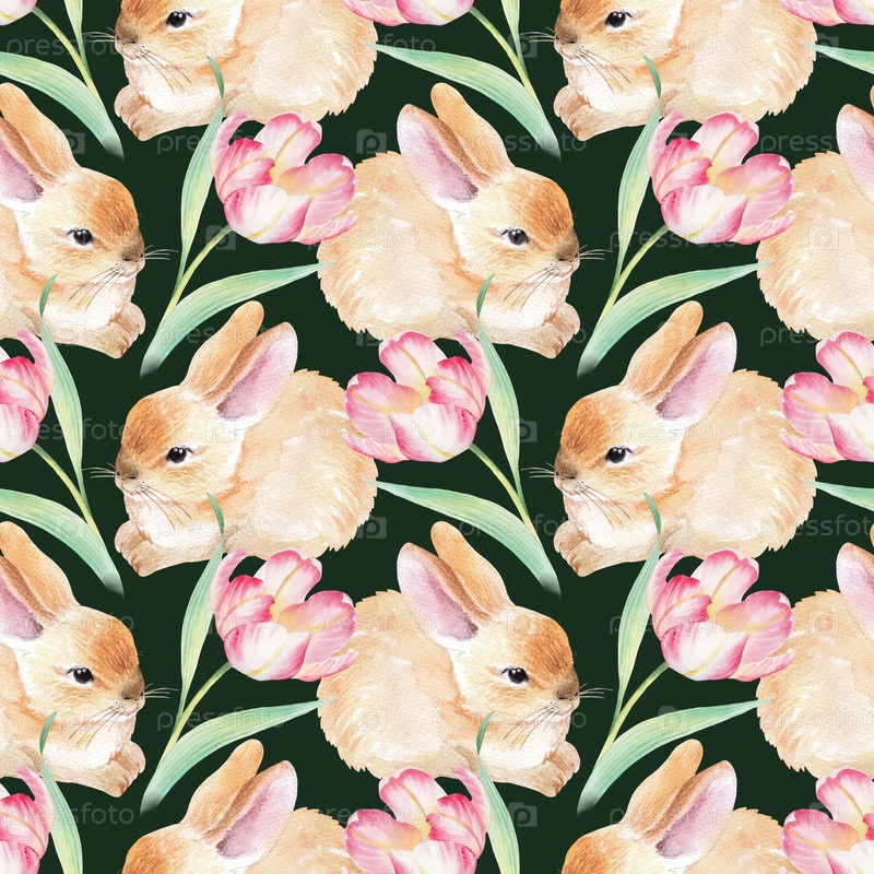Бесшовный рисунок тюльпанов и кроликов на зеленом фоне. Иллюстрация акварельной краски. Для ткани, обоев, упаковочной бумаги, поздравительных открыток, дизайна, декора и иллюстрации
