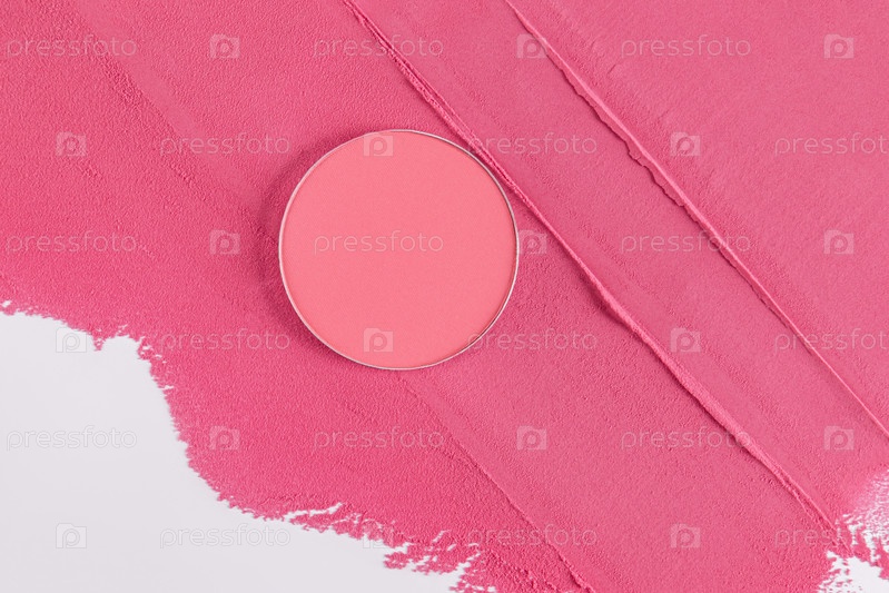 Круглый блок, пополнение розового румжа лежит на фоне сухого красного цвета с узором. текстура косметического продукта, компоновка для дизайна, вид сверху