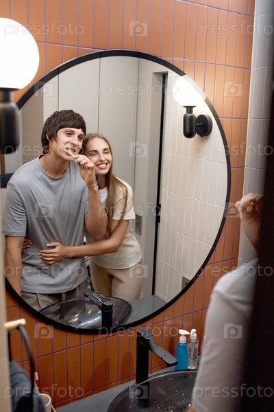 Молодая пара чистит зубы вместе и улыбается в зеркале ванной