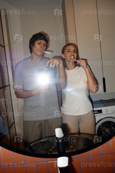Молодой человек фотографирует, пока молодая женщина чистит зубы