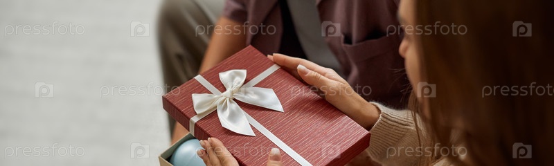 Молодая женщина дарит мужчине коробку с подарками в помещении