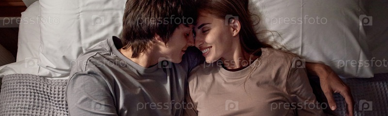 Молодая пара лежит вместе на кровати, улыбаясь и обнимаясь ласково