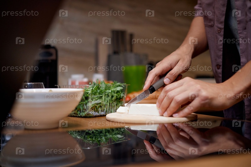 Молодой взрослый мужчина нарезает сыр на доске для резки в современной кухне