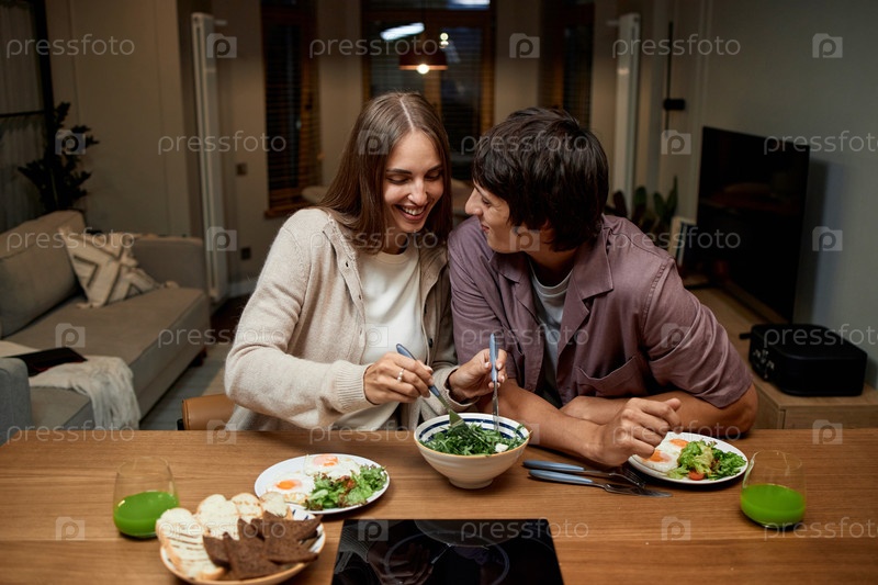 Молодая пара наслаждается ужином вместе и улыбается друг другу