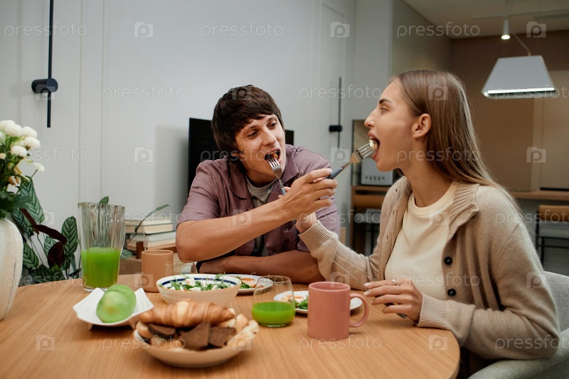 Молодой человек кормит молодую женщину во время совместного завтрака