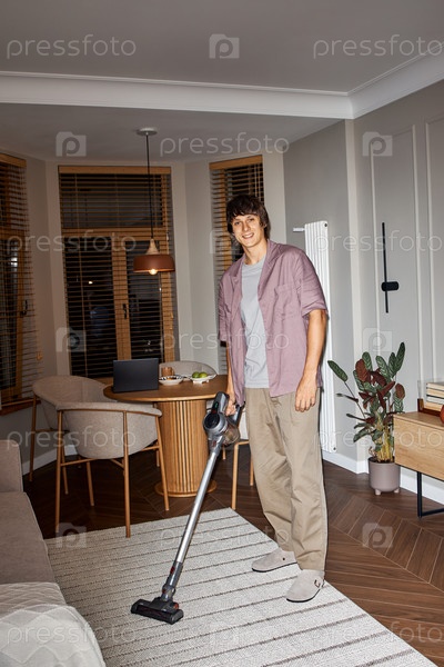 Молодой взрослый мужчина улыбается, пылесосуя ковер в современной гостиной