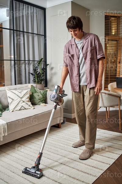 Молодой взрослый мужчина пылесосит ковер в современной обстановке гостиной