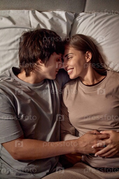 Молодая пара, лежащая в постели улыбаясь и обнимаясь ласково
