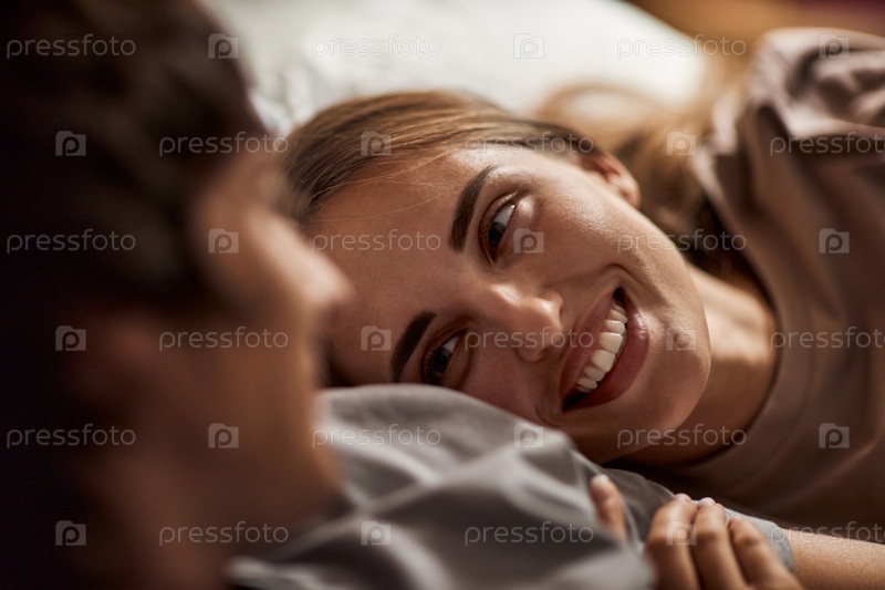 Молодая женщина улыбается, лежа рядом с молодым человеком в помещении