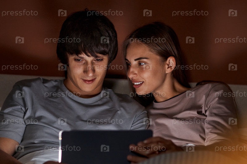 Молодой мужчина и женщина расслабляются вместе, глядя на экраны планшетов в помещении