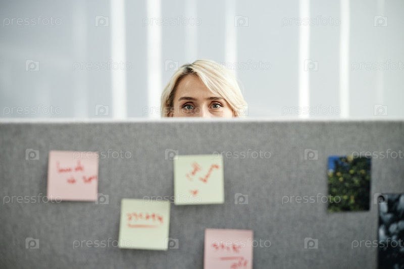 Молодая взрослая женщина заглядывает через офисную перегородку на рабочем месте