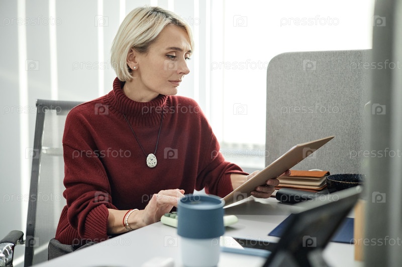Зрелая женщина читает документ, вычисляя данные на рабочем столе в офисе