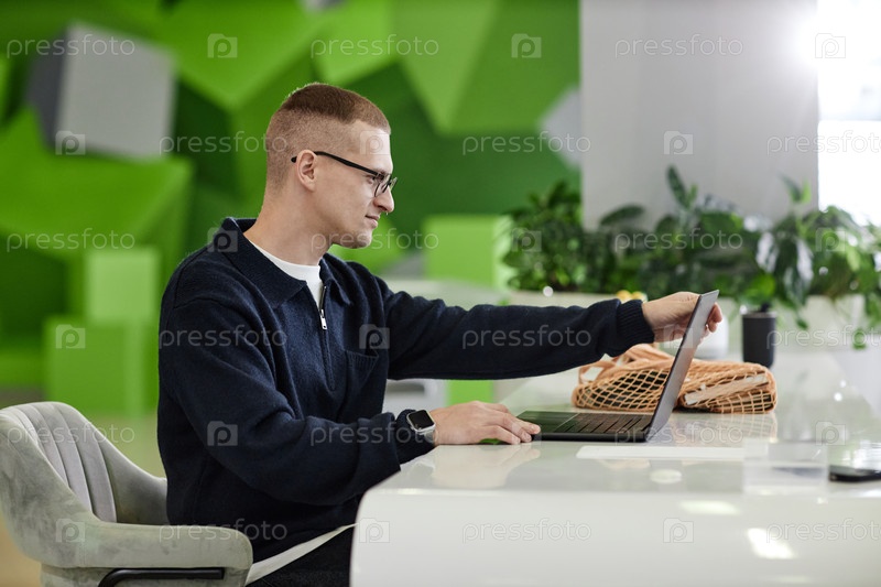 Молодой взрослый мужчина пользуется ноутбуком, сидя за рабочим столом