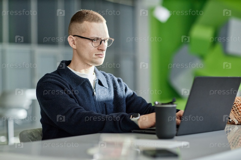 Молодой взрослый мужчина работает на ноутбуке в современной офисной среде