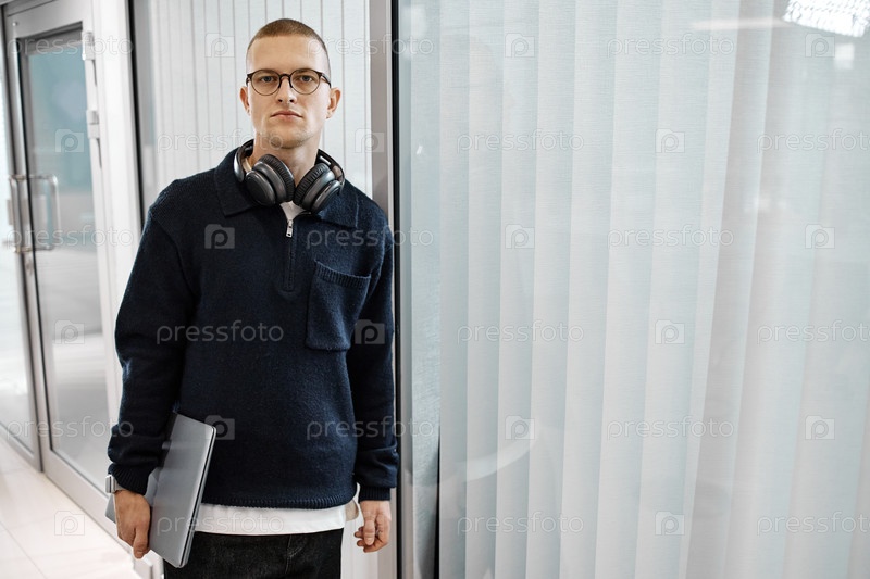 Портрет молодого взрослого мужчины, держащего ноутбук и надевающего наушники
