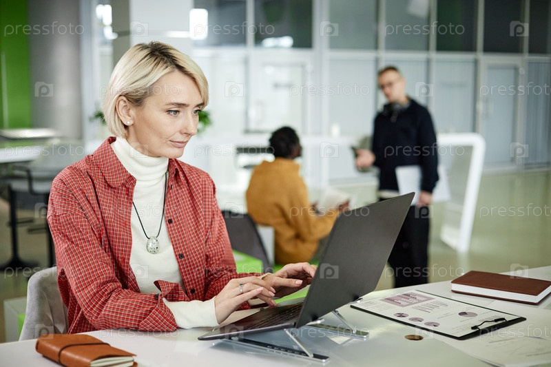 Женщина средних лет, работающая на ноутбуке в современной офисной среде