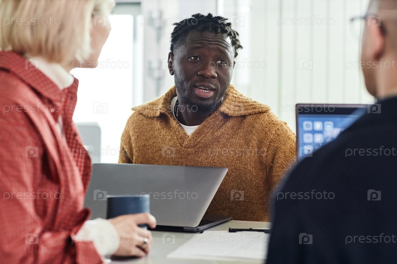 Молодой взрослый чернокожий мужчина обсуждает проект с коллегами на офисной встрече