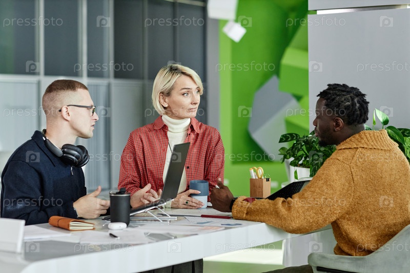 Молодая женщина и два мужчины обсуждают проект в современной офисной обстановке