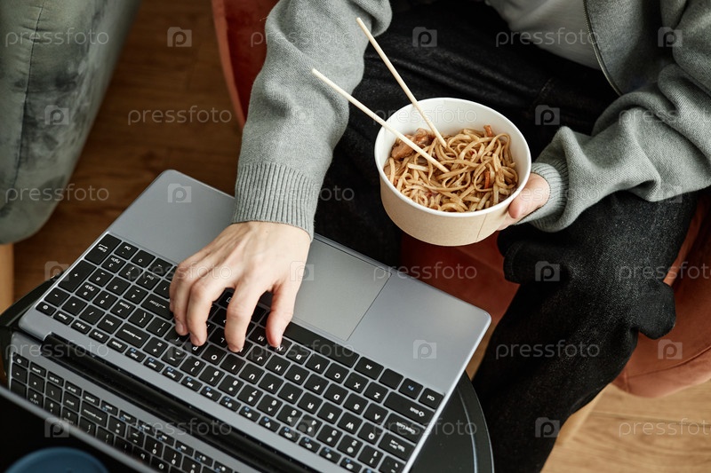 Молодой взрослый мужчина использует ноутбук, едя лапшу с палочками
