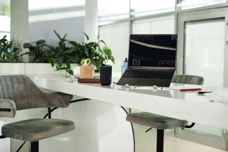 Ноутбук, сидящий на офисном столе в ярком современном рабочем пространстве