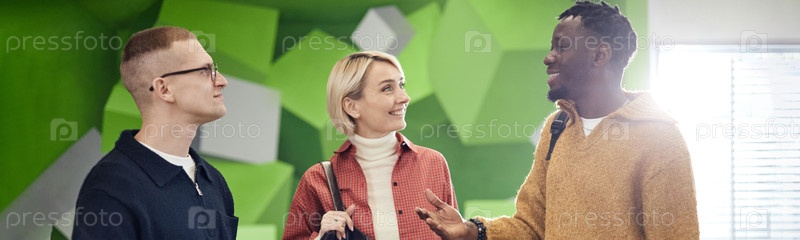 Глава разнообразной бизнес-команды молодых взрослых, улыбающихся и разговаривающих в помещении