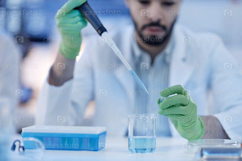 Молодой взрослый мужчина проводит научный эксперимент в лаборатории