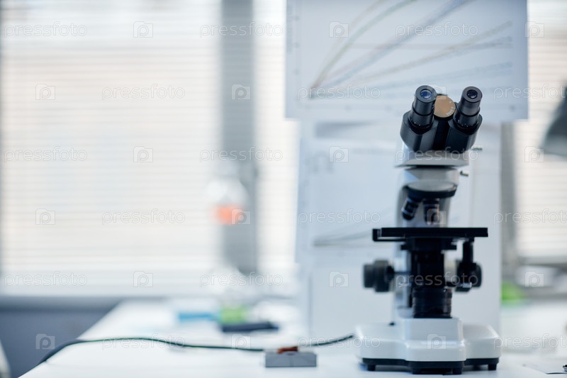 Лабораторный микроскоп стоит на столе с научными графиками в фоне