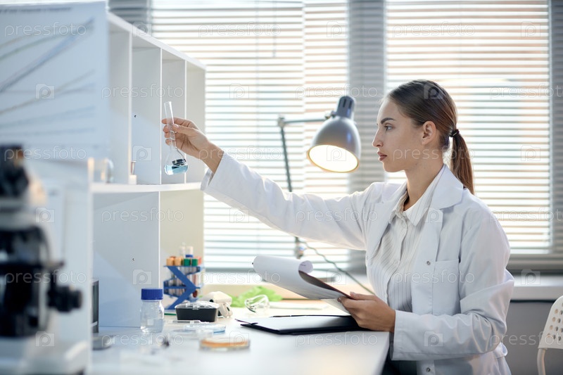 Юная взрослая женщина-ученый анализирует жидкий образец в лаборатории