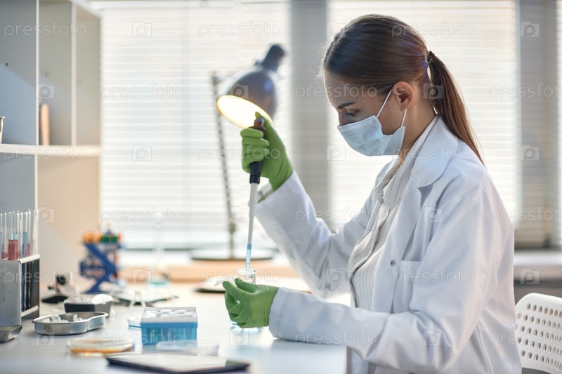 Молодая взрослая женщина, носящая маску, переносит жидкость с помощью пипетки