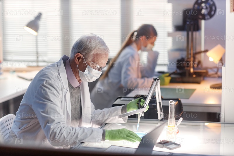 Старший человек, проводящий научный эксперимент в современной лаборатории