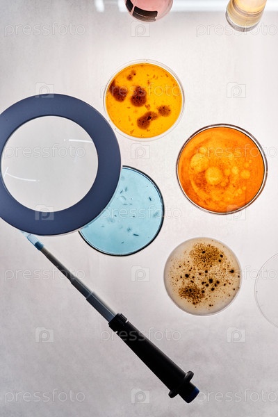 Тарелки Петри с красочными бактериальными культурами под увеличительным стеклом
