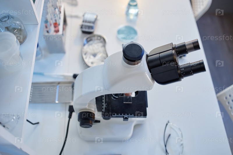 Лабораторный микроскоп, стоящий на столе в научной исследовательской среде