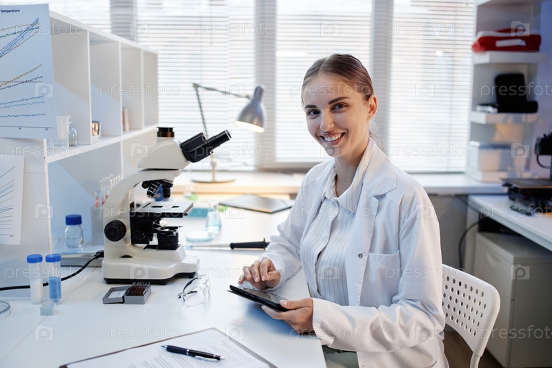 Портрет молодой взрослой женщины, работающей с цифровым планшетом в лаборатории