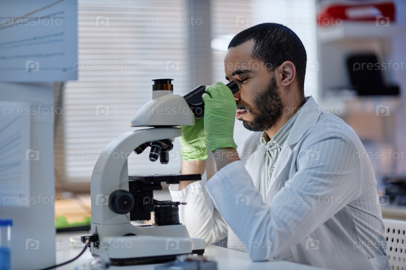 Молодой взрослый мужчина изучает образец под микроскопом в лабораторной обстановке
